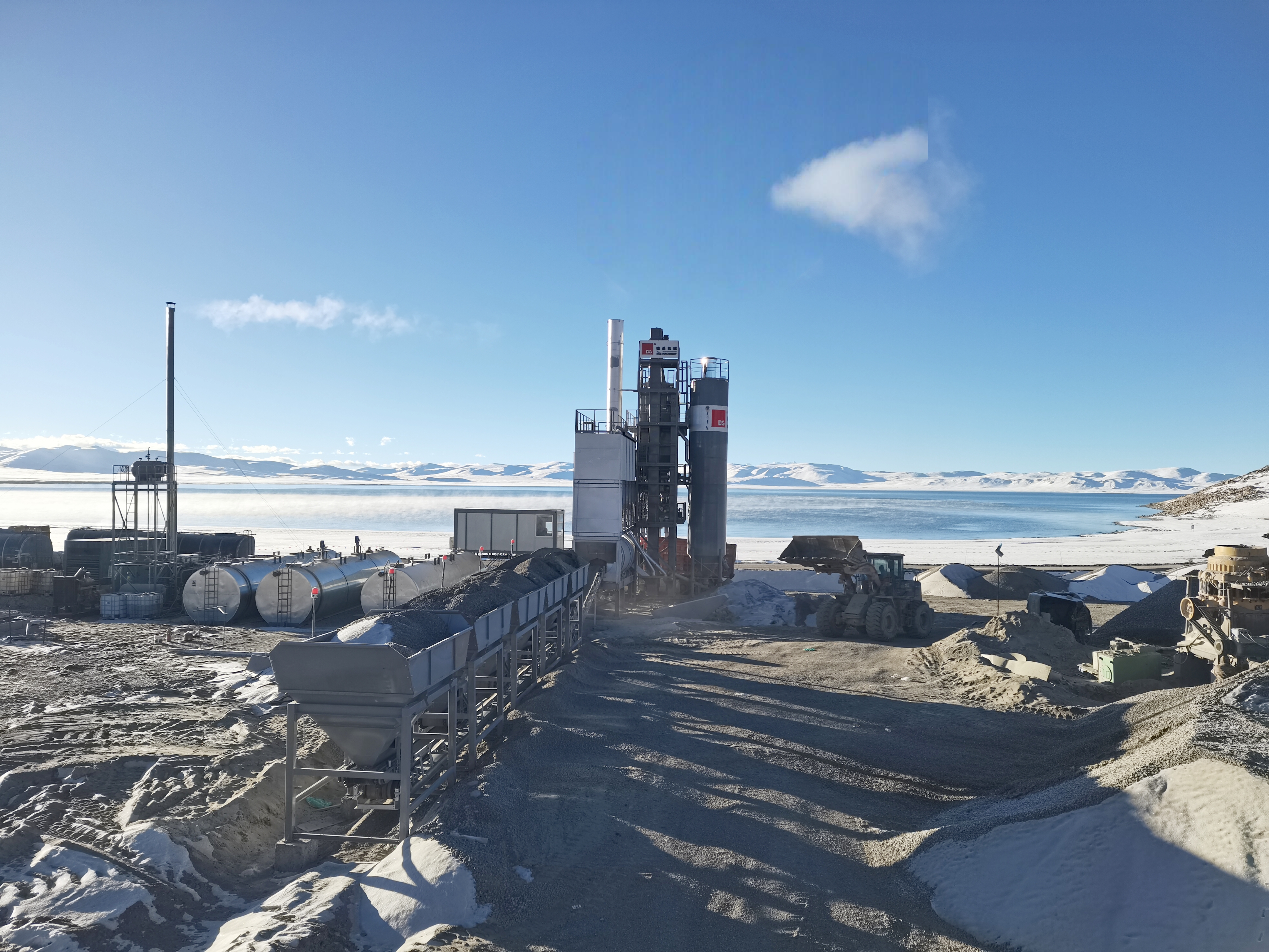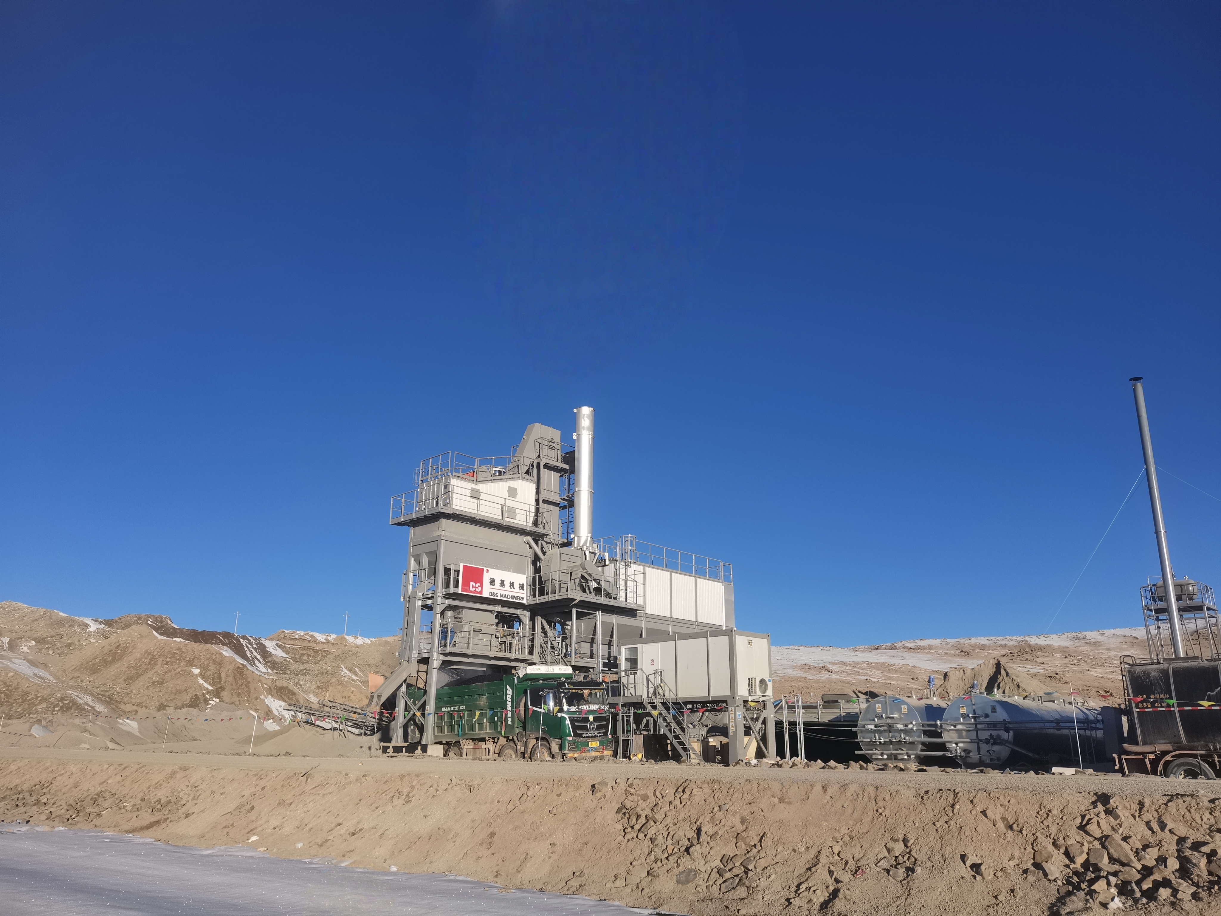 D&G Machinery компаниясының DG2500 асфальт араластыру зауыты қарлы платоның үстінде биік тұр